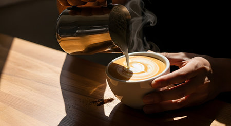 Close-up of a barista's hands pouring steamed milk from a stainless steel pitcher into a cup of espresso to create a heart-shaped latte art design. The dramatic lighting highlights the texture of the foam and the skill of the preparation.
