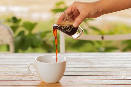 Close up of hands barista man serving coffee in coffee shop. male hands placing a cup of coffee on table. Coffee, Barista, extraction, serve, cafe, lifestyle concept.