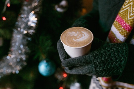 A female barista holds a cup of hot latte in her hand in a cafe. A waitress preparing a customer order.