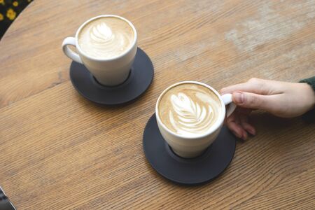 Two cups of aromatic coffee cappuccino or latte on a wooden table. person holds a cup with hand. Concept of meeting or relaxing. Tasty morning drinks.