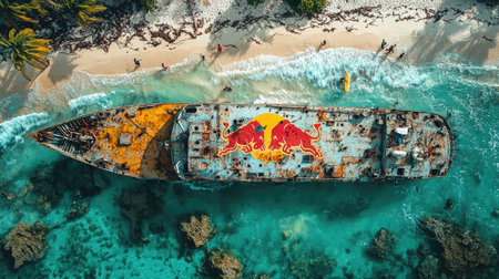 Aerial view of the sandy beach and turquoise water, a person on an abandoned ship surfing between two swells, minimalism, aerial photography, drone shot, award-winning photo, National Geographic magazine, in the style of Canon EOS R5. --chaos 30 --ar 16:9 --quality 2 --stylize 500 --v 6.1 Job ID: 2fad5f71-d280-4468-8d28-50fb1540acf6