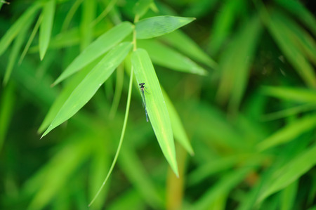 Common bluetail damselfly (zygoptera ) dragonfly insect close up sitting on leaf with raindrops early morning, shallow depth of field blurred nature background