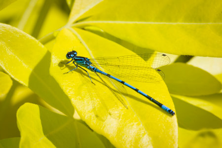 A Common blue damselfly resting on a leaf, sunny day in summer