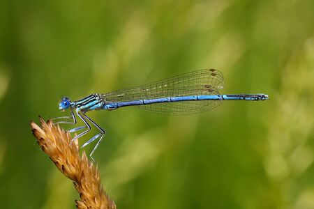Common blue damselfly or Northern bluet male sits on blade of grass. Enallagma cyathigerum on green blurred background