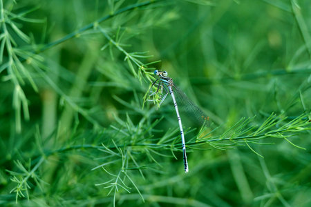 White-legged Damselfly (Platycnemis pennipes) resting on an asparagus fern
