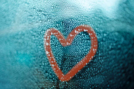 Love, Sadness, Loneliness and Unhappy in Relashionship Concept. Red Heart Shape on Glass Window in Rainy Day