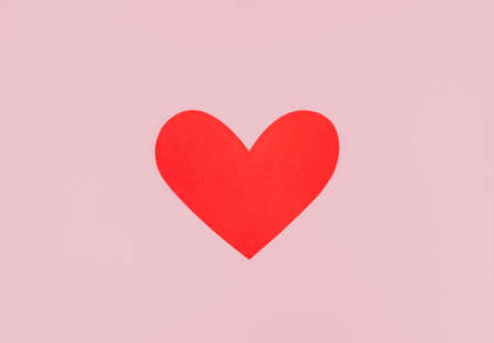 Valentine's Day sign. Top view photo in minimal style. Big red paper heart on pastel pink background