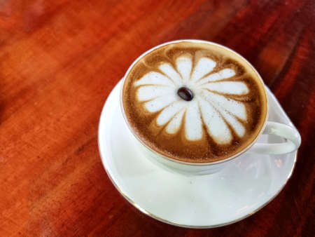 Close-up of Hot coffee latte with latte art milk foam in cup or mug on desk in coffee shop at the cafe business work concept