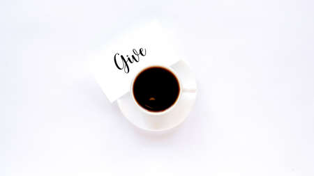 A cup of coffee on a white dish with a note with message. White background