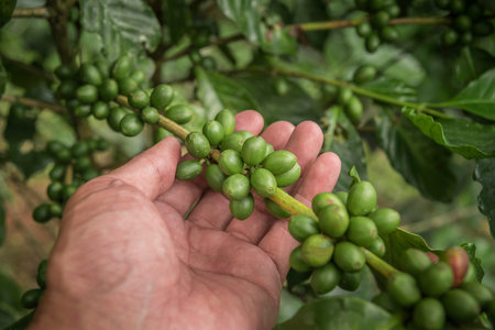 Arabica coffee, green Arabica coffee beans unripe on northern Thailand sources waiting for harvest to process.