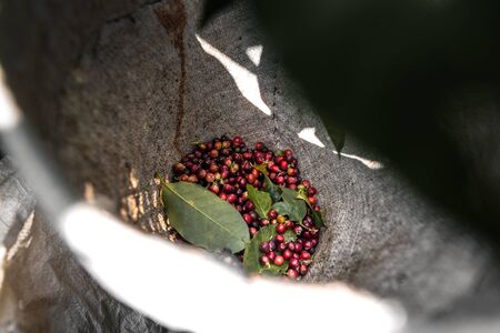 Coffee farmer picking ripe cherry beans, Fresh coffee bean in basket, Close up of red berries coffee beans.
