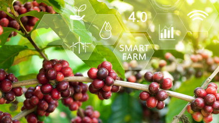 Coffee bean tree with infographics Smart farming and precision agriculture 4.0 with visual icon, digital technology agriculture and smart farming concept.