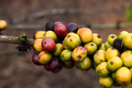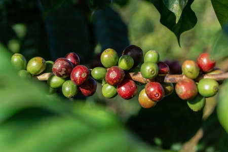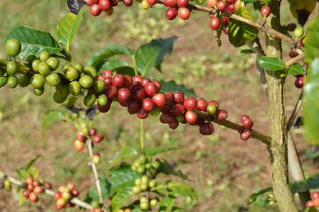 Coffee beans on a branch of tree.Red and green arabica coffee beans ripening on tree in coffeee plantation.