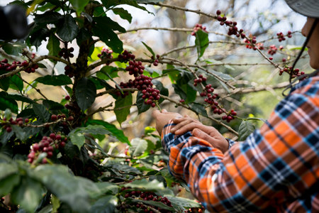 Farmer picking coffee bean in coffee process agriculture background, Coffee farmer picking ripe cherry beans, Close up of red berries coffee beans.
