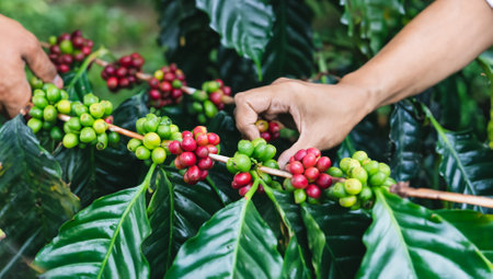 Farmer concept harvest fruit ripe coffee seed robusta arabica berry close up fresh green leaf bean picking orange crop red yellow berries raw plant tree farm growth blur background eco organic garden