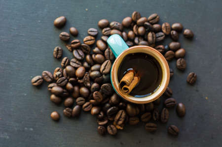 Rustic cup of coffee with cinnamon spice and coffee beans on dark background
