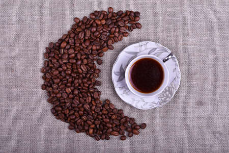 Composition cup of coffee with moon made by coffee beans on linen texture table
