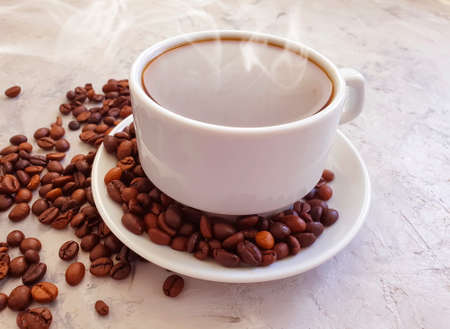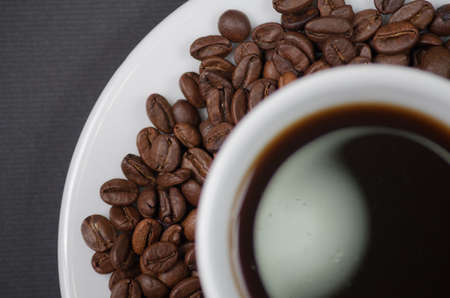 White plate, cup of coffee on a bunch of roasted coffee beans background. High quality photo