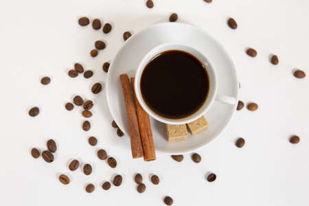 Cup of aromatic coffee on a white background with sugar, cinnamon and coffee beans