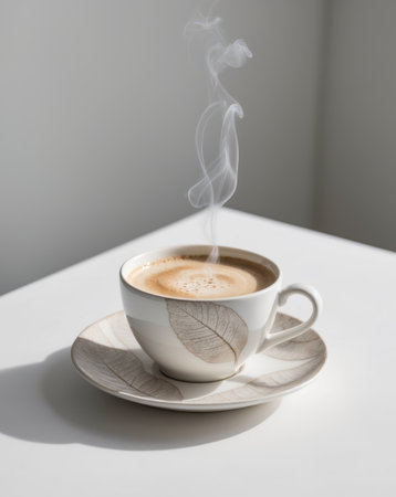 cup of hot coffee with foam and smoke on table in the morning. copyspace for your text