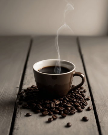 AI Generated. cup of coffee with coffee beans on wooden table