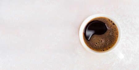 Freshly brewed coffee with foam in a white cup on a light background, top view. Morning invigorating drink. Banner, place for text and advertising.