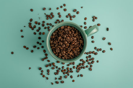 Dark green ceramic coffee cup surrounded by coffee beans on soft pastel green background