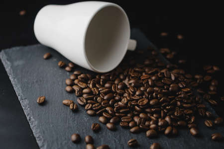 Close up coffee bean spilt from white cup on a rock stone slate. Selected Focus. Copy Space Concept