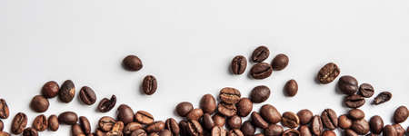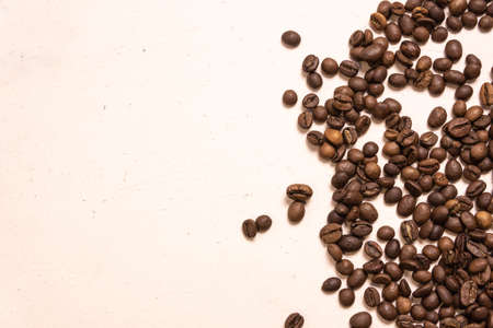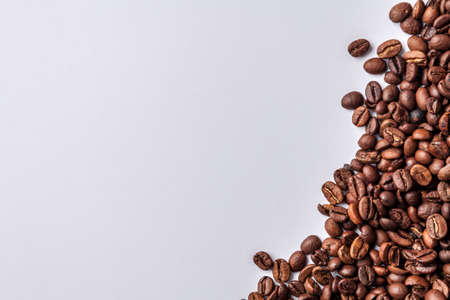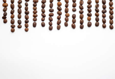 brown coffee beans on white paper background. Coffee beans at the top of the picture. Coffee Border