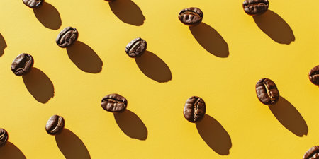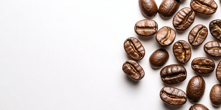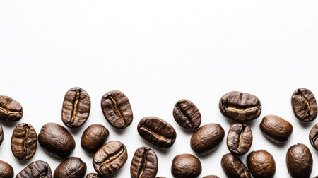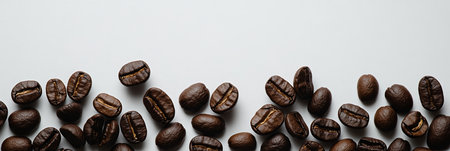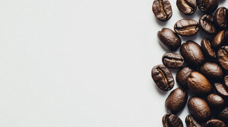 A visually appealing arrangement of roasted coffee beans scattered elegantly around a spacious copy space, ideal for coffee lovers and brands