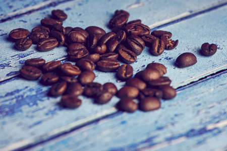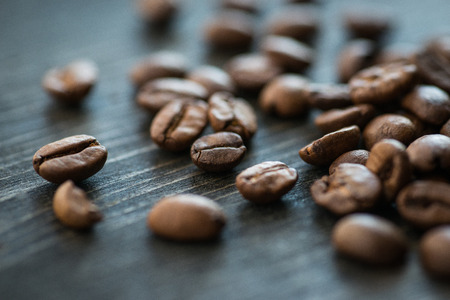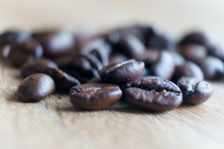 Roasted arabica coffee beans scattered on a wooden table. Fresh coffee beans.
