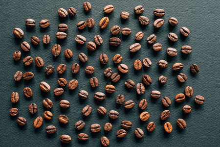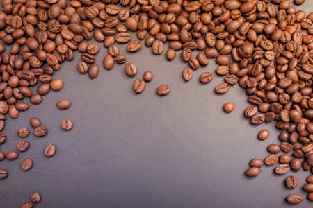 Arabica coffee beans on a stone background. Dark coffee beans on rustic background. Close up. Top view.