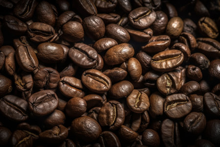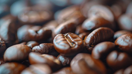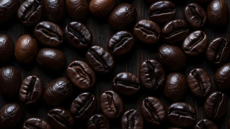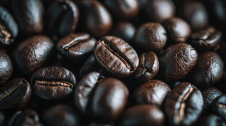 Experience the allure of freshly roasted coffee beans in this close-up shot showcasing their glossy texture and reflective quality.