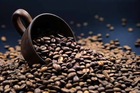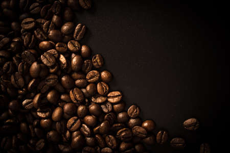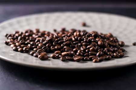 Close-up of coffee beans. Selective focus. Macro photo of coffee on dark textural background. Painting in a coffee shop or restaurant