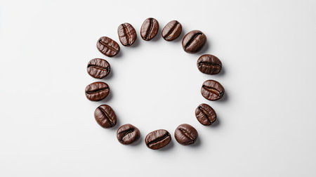 A stunning circular formation of roasted coffee beans on a clean white background, perfect for showcasing the essence and beauty of coffee.