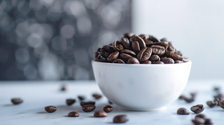 A minimalist composition featuring a white ceramic bowl filled with rich, roasted coffee beans on a clean white surface.