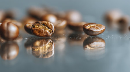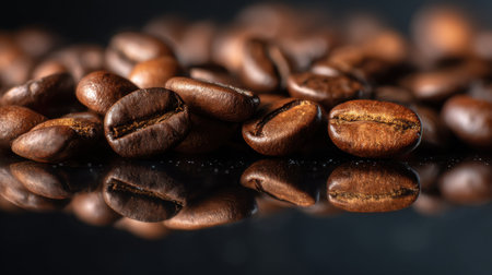 This captivating close-up image showcases roasted coffee beans lying on a dark reflective surface, highlighting their rich texture and deep color.