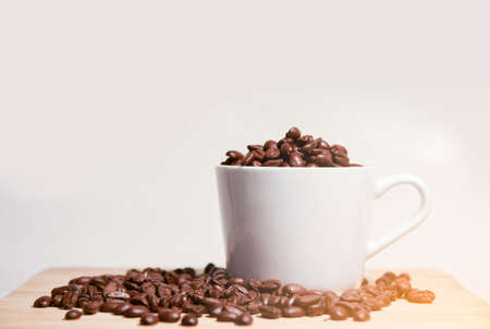 Roasted coffee beans in white cup with roasted coffee beans on white background.