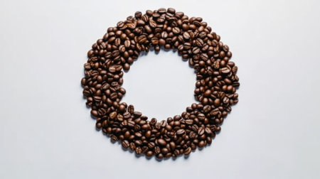 Coffee beans forming a circular pattern on a pristine white surface, highlighting the symmetry and contrasting textures.