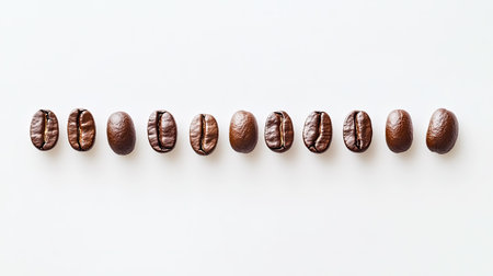 A neat row of coffee beans aligned perfectly in a line, showcasing their rich brown tones against a pure white background.