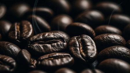 A detailed macro close-up shot of dark roasted coffee beans, showcasing their rich texture and deep brown color. Delicate wisps of steam rise from the beans, suggesting their warmth and fresh aroma. captures the essence of coffee, use in food and beverage-related or as a background evoking a sense of morning energy and a cozy atmosphere. The focus is on the intricate details and natural appeal of the roasted beans.