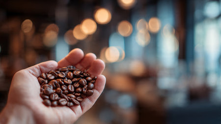 Roasted coffee beans. Coffee plantation, coffee bean farm. Aroma, harvest, production. Fresh, dark, rich.