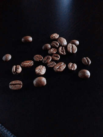Levitating roasted coffee beans on black background dynamic movement of flying coffee beans