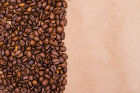 Coffee bean background. Dark roasted coffee beans are scattered on the Kraft paper. Texture.