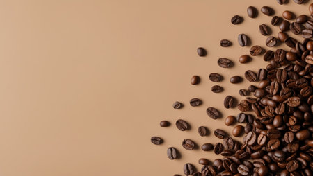 A collection of freshly roasted coffee beans scattered on a light background, highlighting rich textures and tones perfect for beverage enthusiasts.