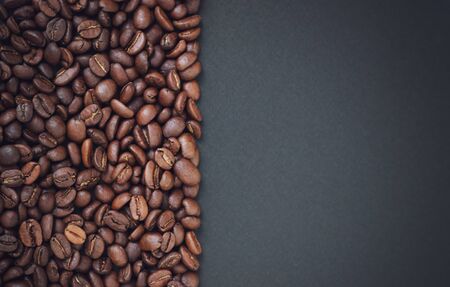 Banner with fresh roasted coffee beans closeup on black stone background. Top view, flat lay with copy space