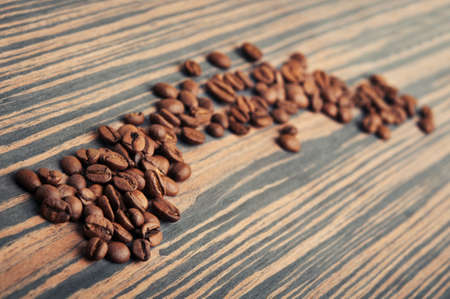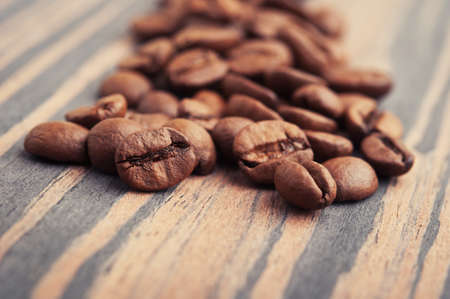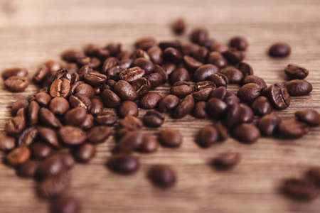 Brown coffee beans, closeup of macro coffee beans for background and texture. On brown wooden board