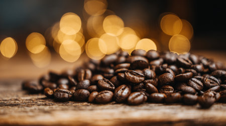 A close up of dark roasted coffee beans scattered on a rustic wooden surface with glowing lights in the background.
