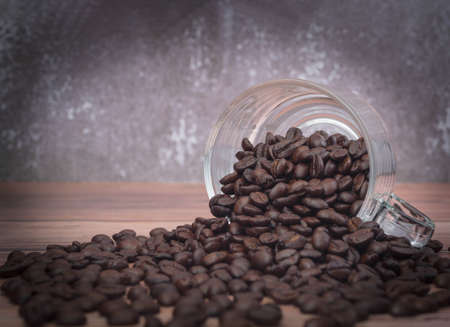 Close up glass espresso cup filled with fresh organic coffee beans and roasted beans on wooden floor and copy space