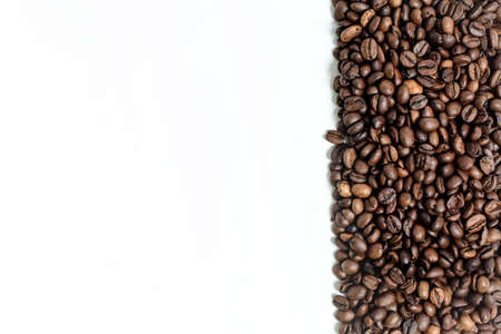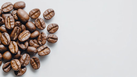 A captivating closeup of richly roasted coffee beans arranged on a white surface, showcasing their deep brown color and natural texture, ideal for promoting coffee culture and showcasing flavors. Perfect for coffee enthusiasts seeking quality and warmth.